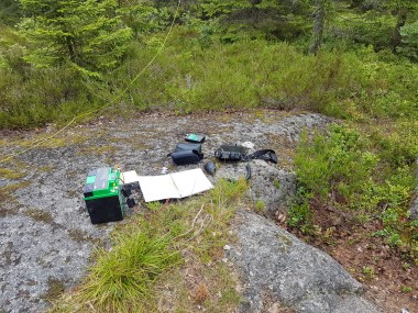 Dags att hänga på ryggsäcken och börja den 1,2 kilometer långa promenaden till toppen, med drygt 100 höjdmeter stigning. I packningen lade jag radio, antenn, glasfibermast och batteri, fika och smaskens viktigt att inte glömma det.